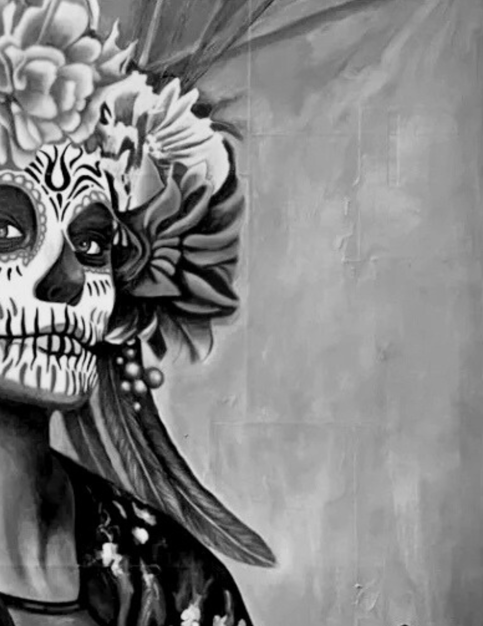 • Black and white portrait of a smiling woman with short hair, earrings, and a large flower accessory on her clothing.